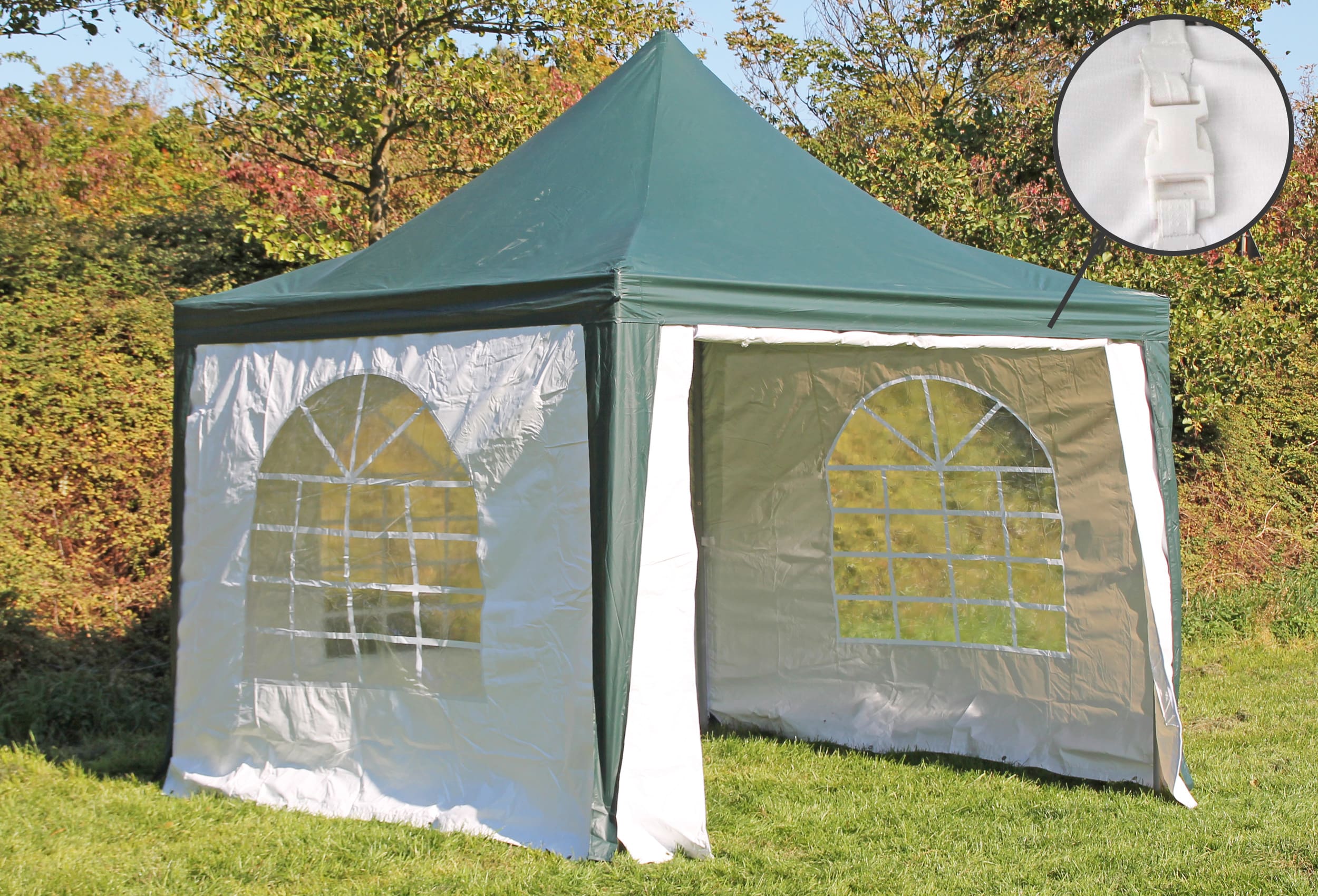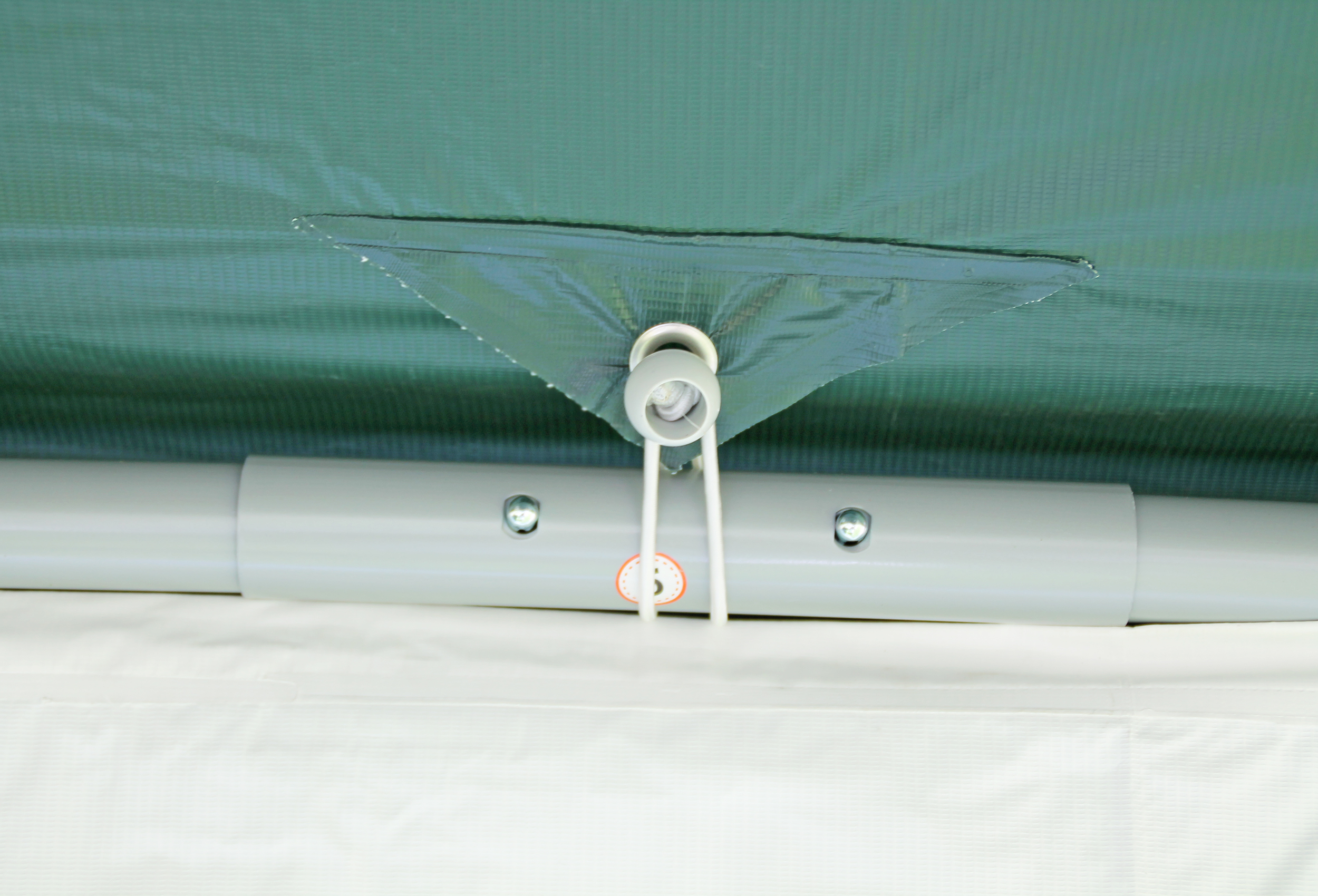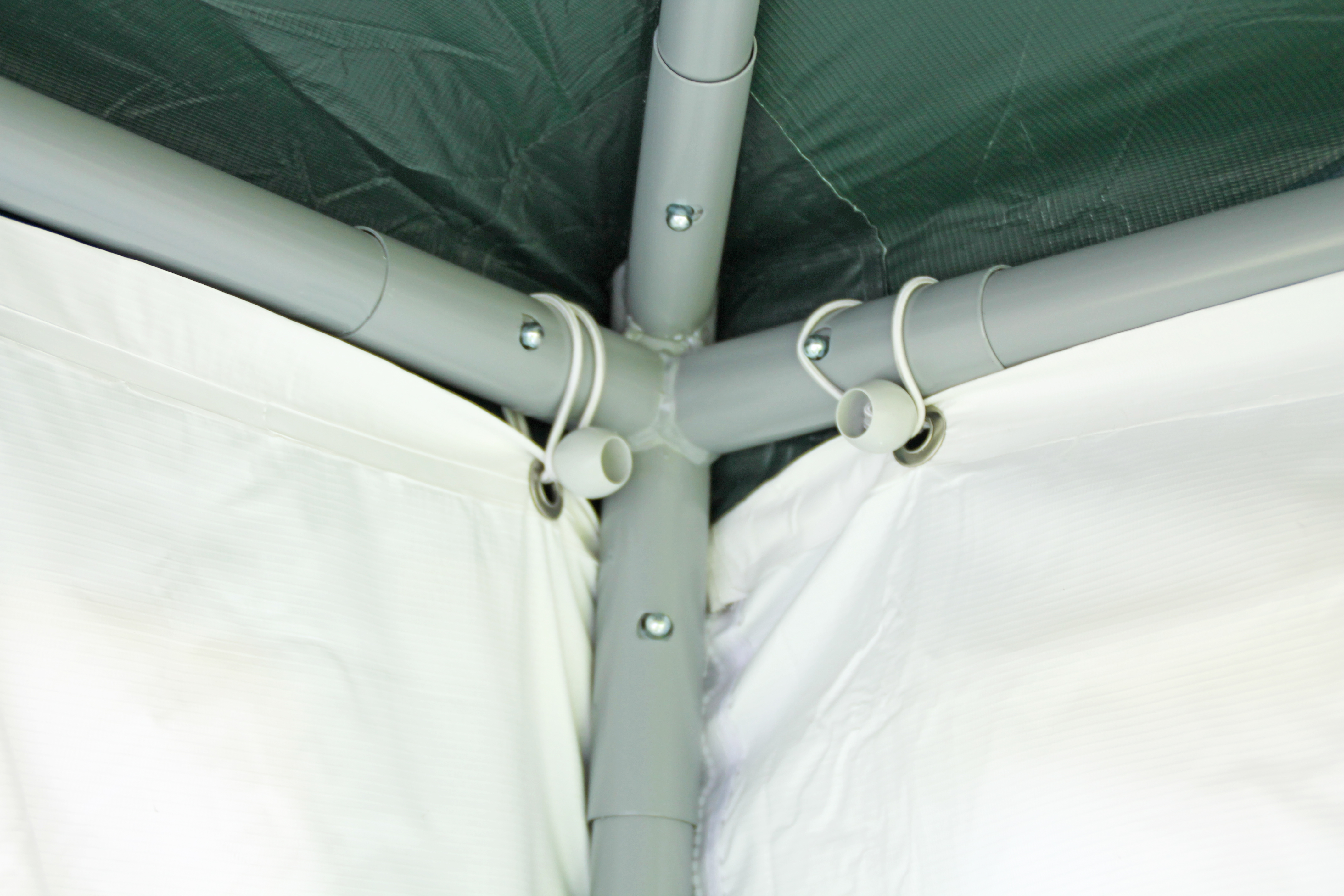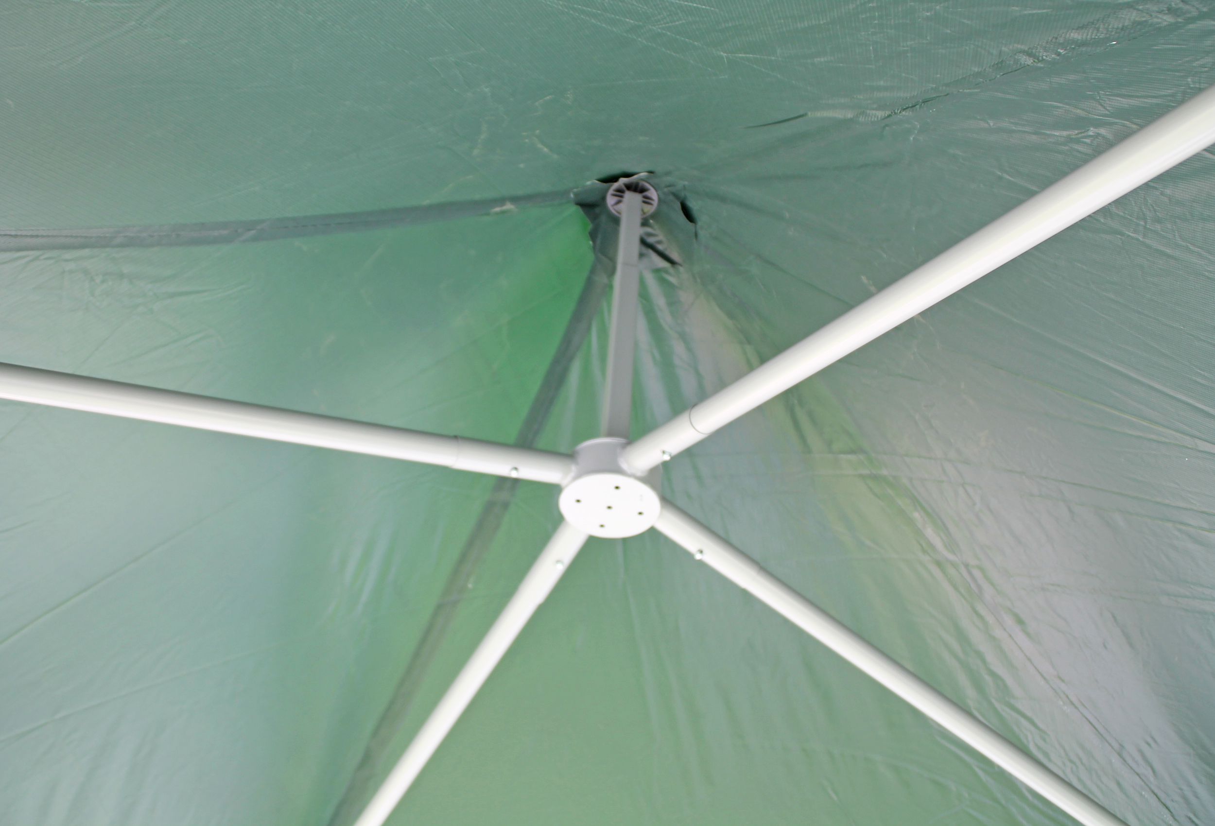 Strong 38 mm uprights and 43 mm connectors with 1.1 mm and 1.2 mm material thickness made of solid steel tube The roof construction has strong 32 mm poles with 1.0 mm material thickness Robust and stable construction with high side and centre height of 2.10 m and 3.15 m Roof top with self-adjusting automatic spring mechanismNo simple crank - no overstretching 5-year guarantee5) against rusting through - baked at 200°C and resistant powder coating of the finished welded parts