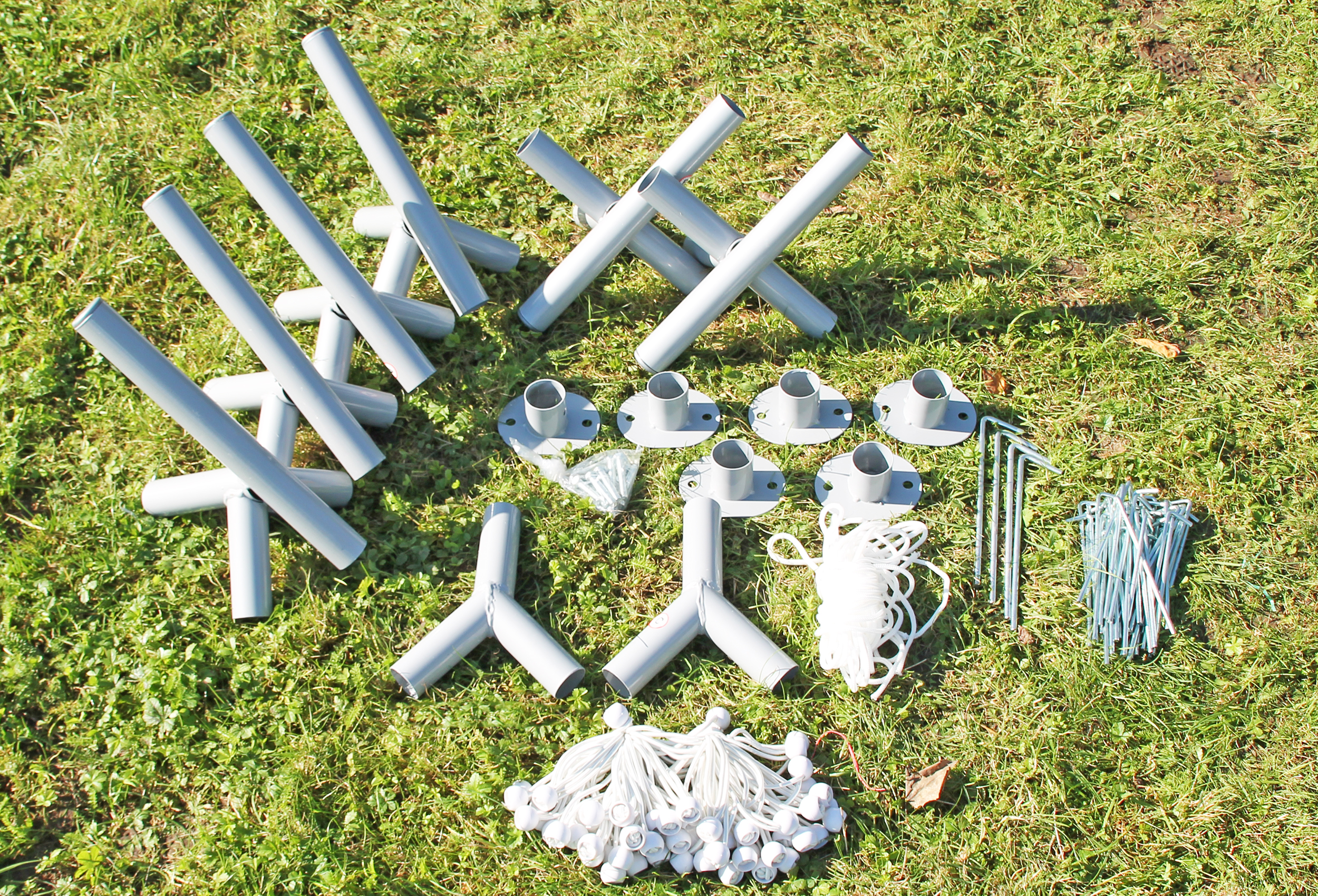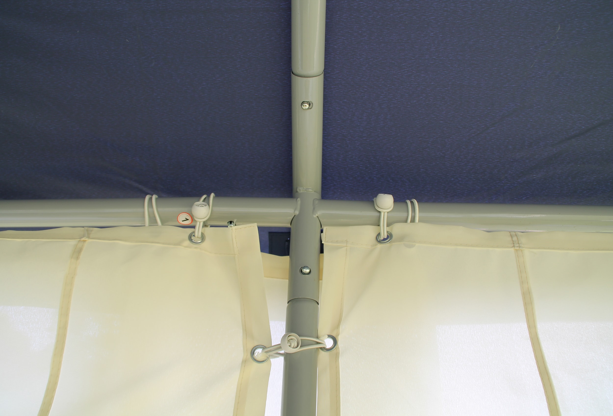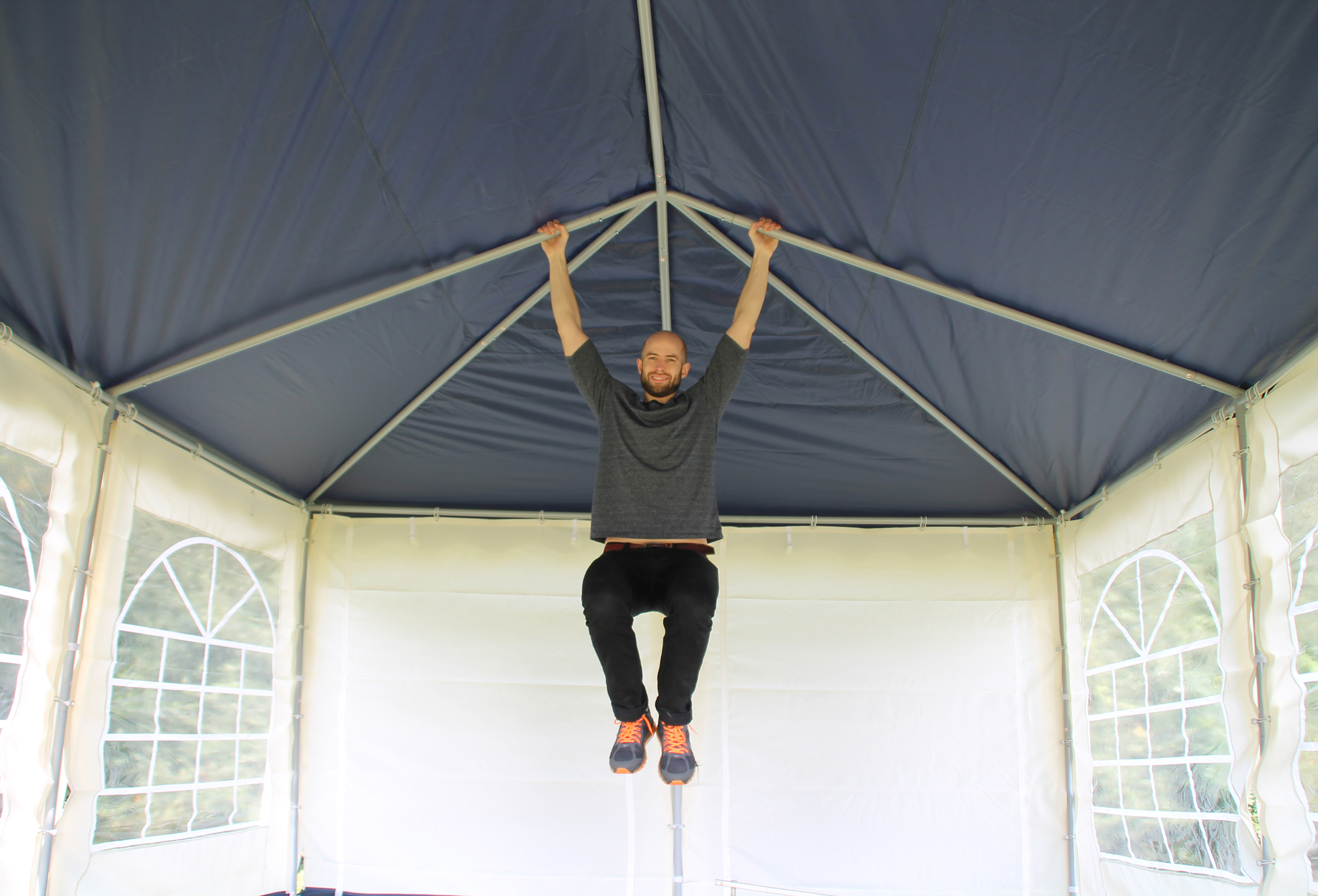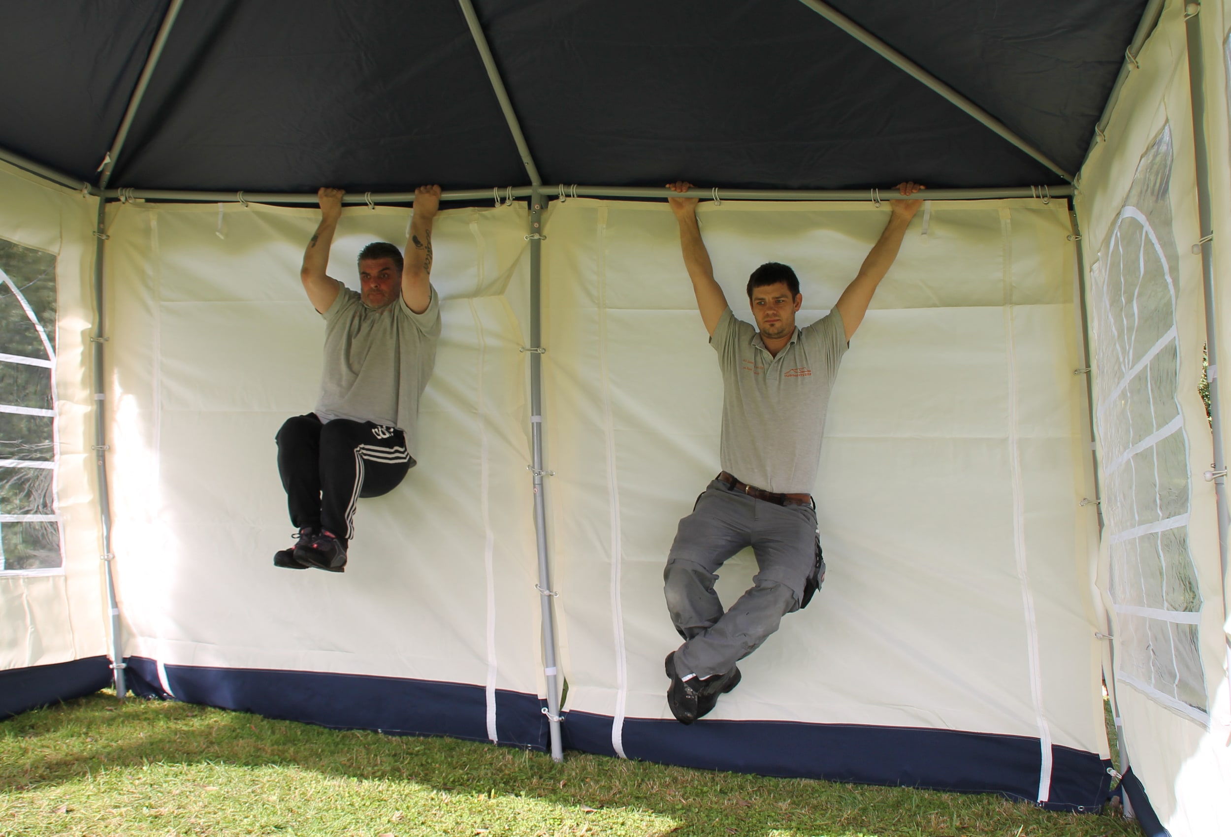 Thick 38 mm poles and 43 mm connectors with 1.0 mm and 1.2 mm material thickness made of solid steel tube Robust and stable construction with high side and centre height of 2.10 m and 2.80 m 5-year guarantee5) against rusting through - resistant powder coating of the finished welded parts baked at 200°CNo simple raw material galvanisation with repainted weld seams - no oil film or oxidised zinc Stable click system - quick to assemble and super stable and easy to handle thanks to high material thicknesses