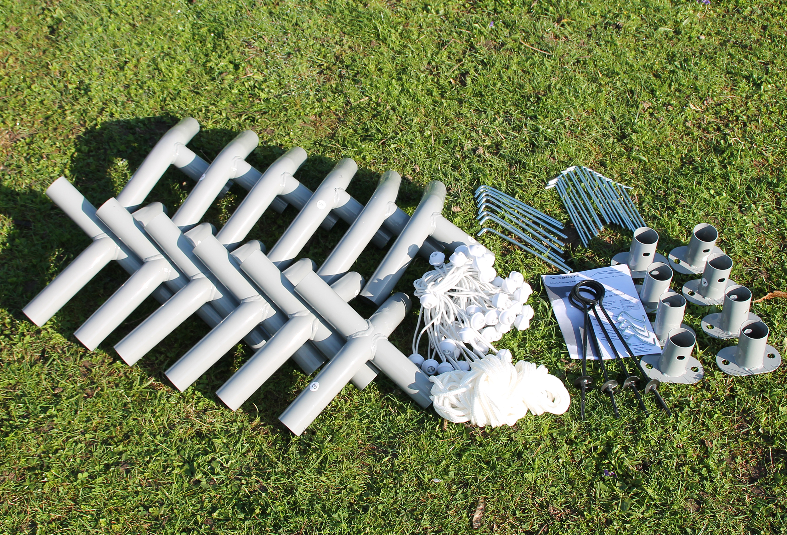 All tarpaulin sections are flush with the ground and can be secured in the ground with the supplied Tarpaulin ground hooks