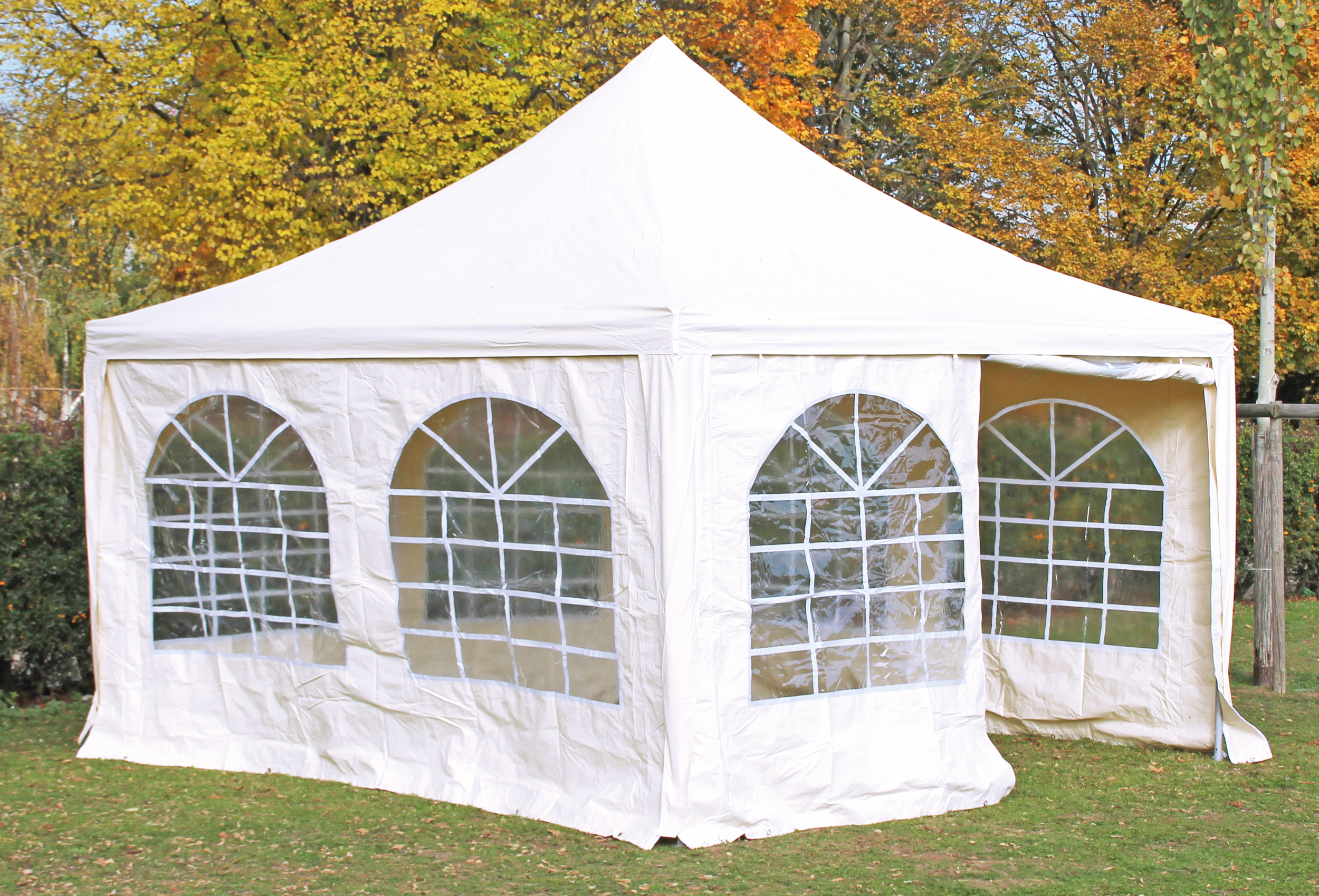 comparable to truck tarpaulin Roof tarpaulin in one piece - high stability All side sections with large panoramic windows for a light-flooded tent