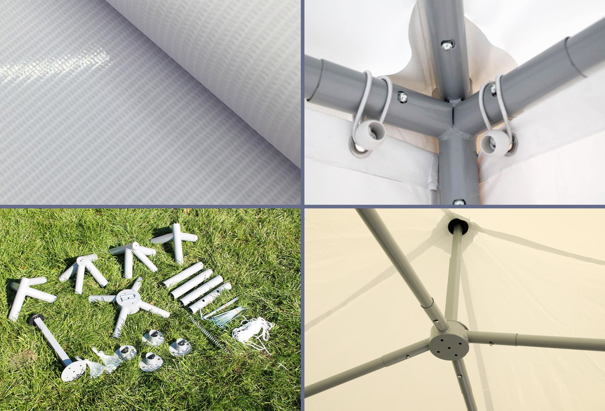 Strong 38 mm uprights and 43 mm connectors with 1.1 mm and 1.2 mm material thickness made of solid steel tube The roof construction has strong 32 mm poles with 1.0 mm material thickness Robust and stable construction with high side and centre height of 2.10 m and 3.50 m Roof top with self-adjusting automatic spring mechanismNo simple crank - no overstretching 5-year guarantee5) against rusting through - baked at 200°C and resistant powder coating of the finished welded parts