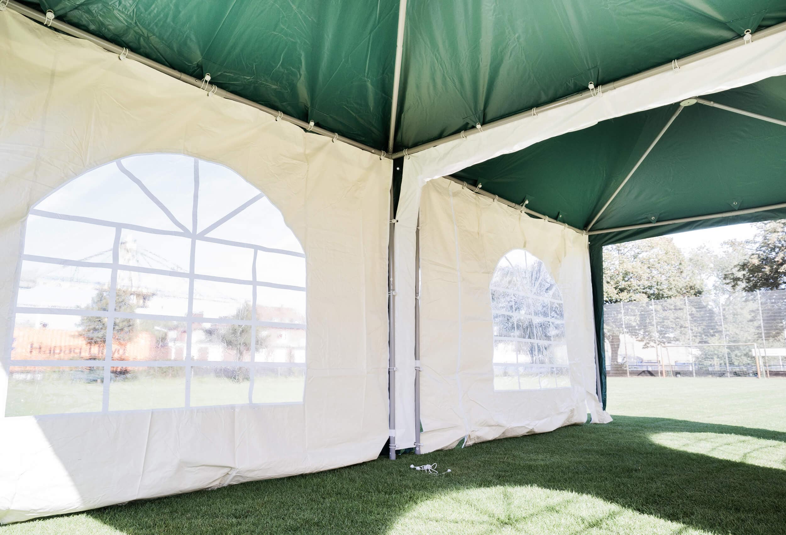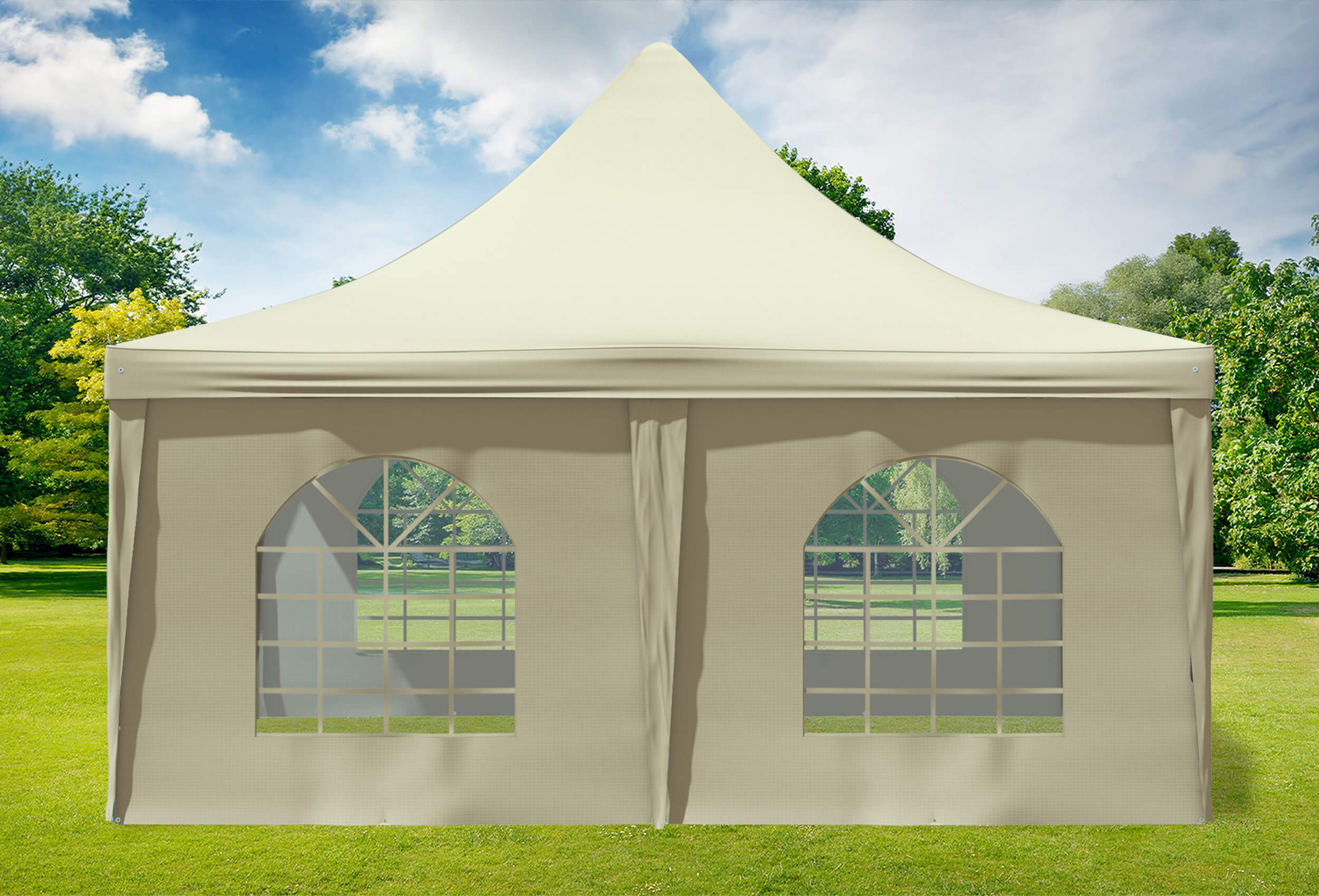 comparable to truck tarpaulin Roof tarpaulin in one piece - High stability Side sections with large panoramic windows for a light-flooded tent
