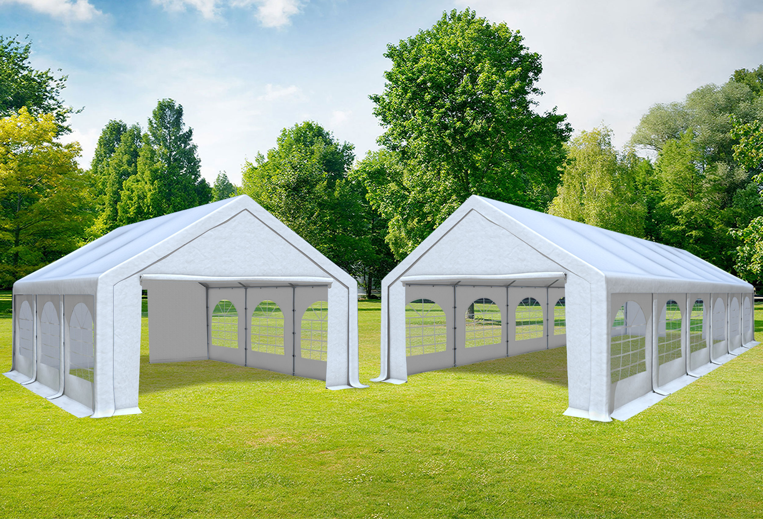 The bestseller among the stable party tents for all professionals and those who want to become one. Even more flexible as a ready-made combi tent version. The additional roof tarpaulin opens up various set-up options. Super stable and high-quality powder-coated tubular steel poles and grid fibre-reinforced 500 g/m² Professional PVC are the hallmarks of the Modular model. 100% waterproof thanks to welded seams. Variable in construction and can be set up or converted at any time with suitable accessories. The side sections can be assembled individually at 2 metre intervals depending on requirements . This results in many assembly options depending on the size. High stability, robust materials and ready for immediate use thanks to a comprehensive range of accessories. Easy to clean thanks to the shiny, smooth surface.