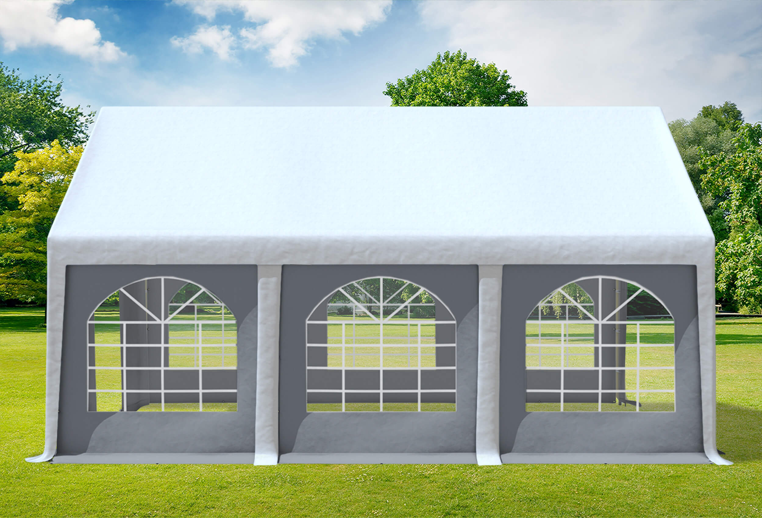 % €849.00 (9.89% saved)The bestseller among the stable party tents for all professionals and those who want to become one. Super stable and high-quality powder-coated tubular steel poles and grid fibre-reinforced 500 g/m² Professional PVC characterise the Modular model. 100% waterproof thanks to welded seams. Variable in construction and can be set up or converted at any time with suitable accessories. The side sections can be fitted individually at 2 metre intervals as required. This results in many assembly variants depending on the size. High stability, robust materials and ready for immediate use thanks to a comprehensive range of accessories. Easy to clean thanks to glossy, smooth surface.