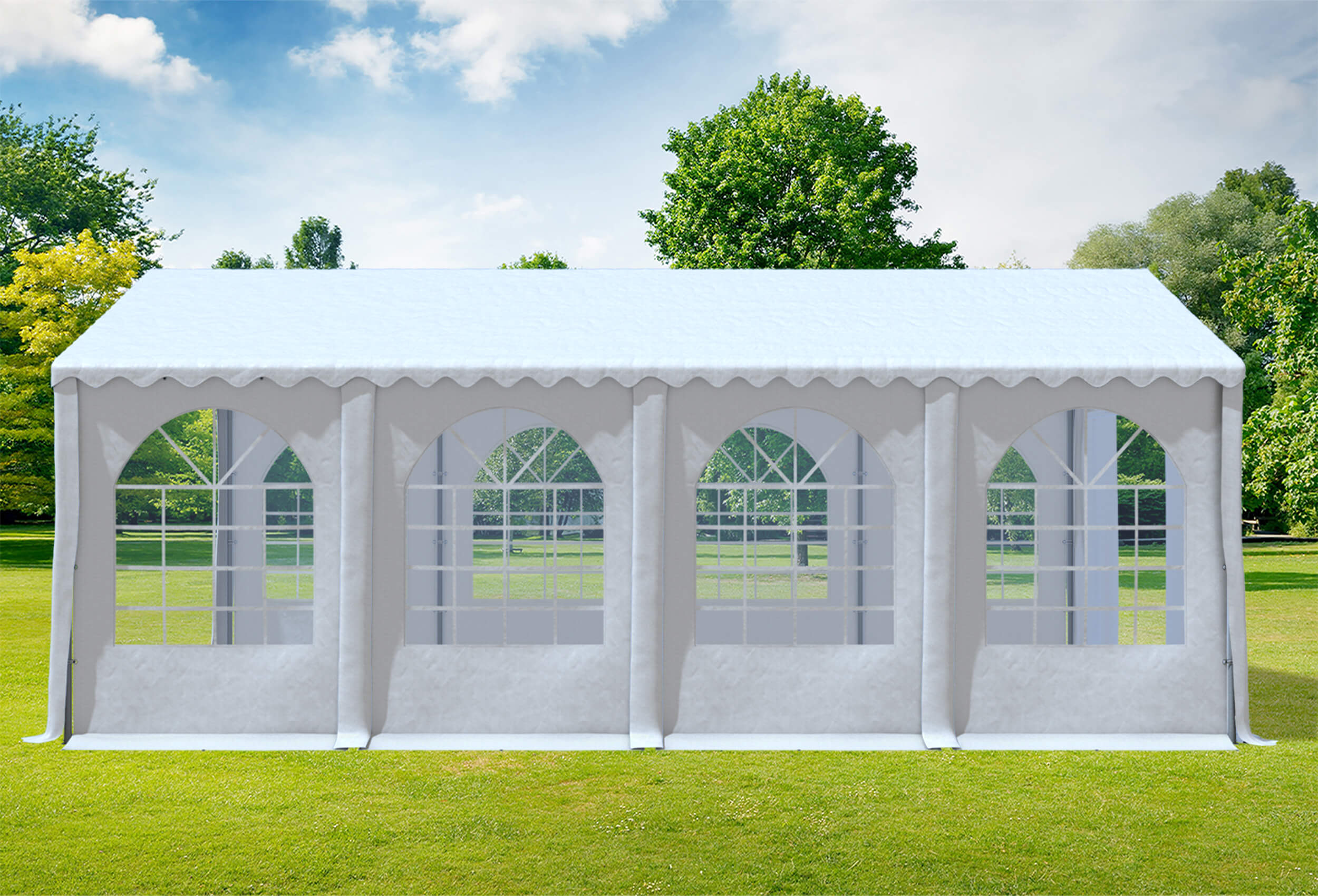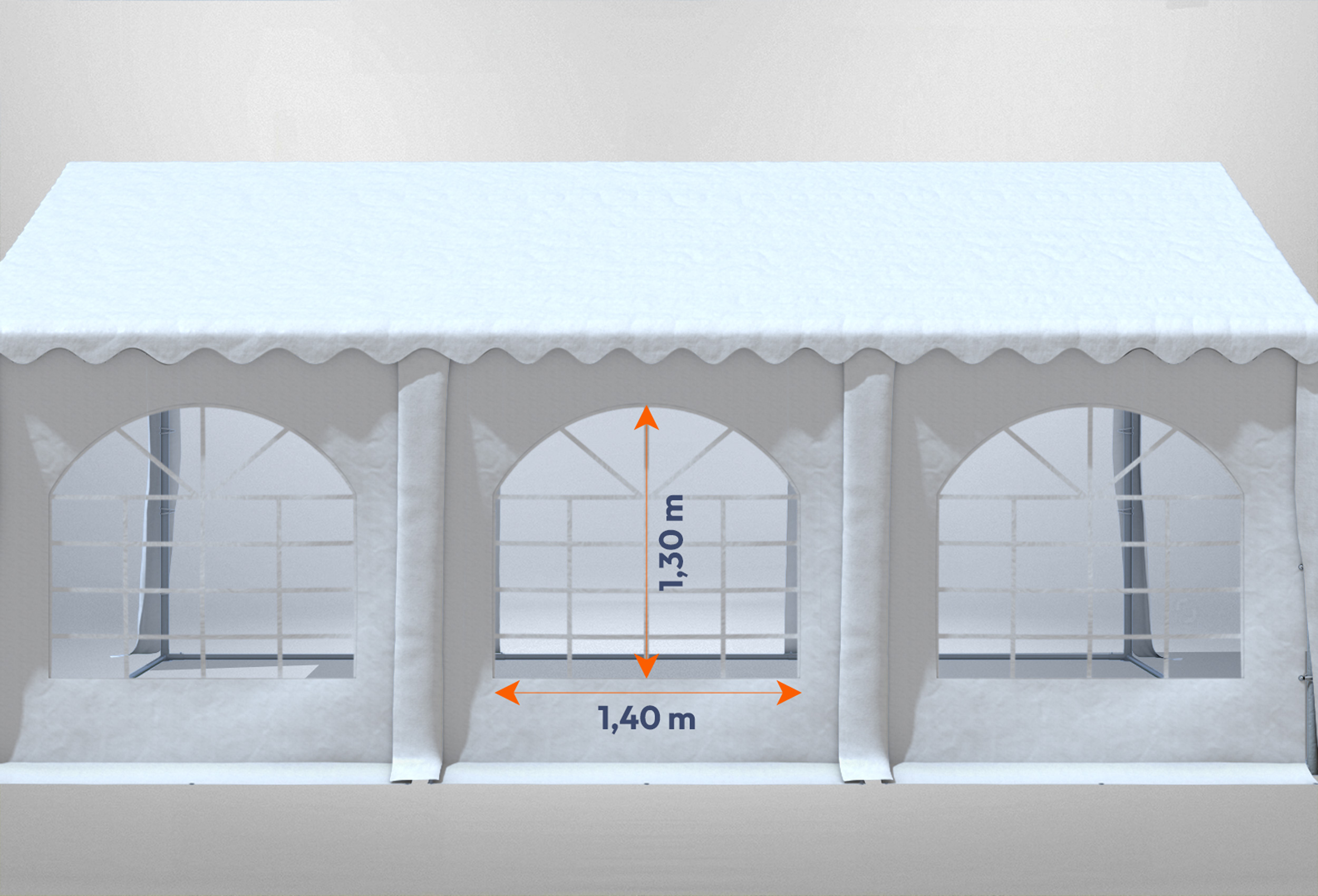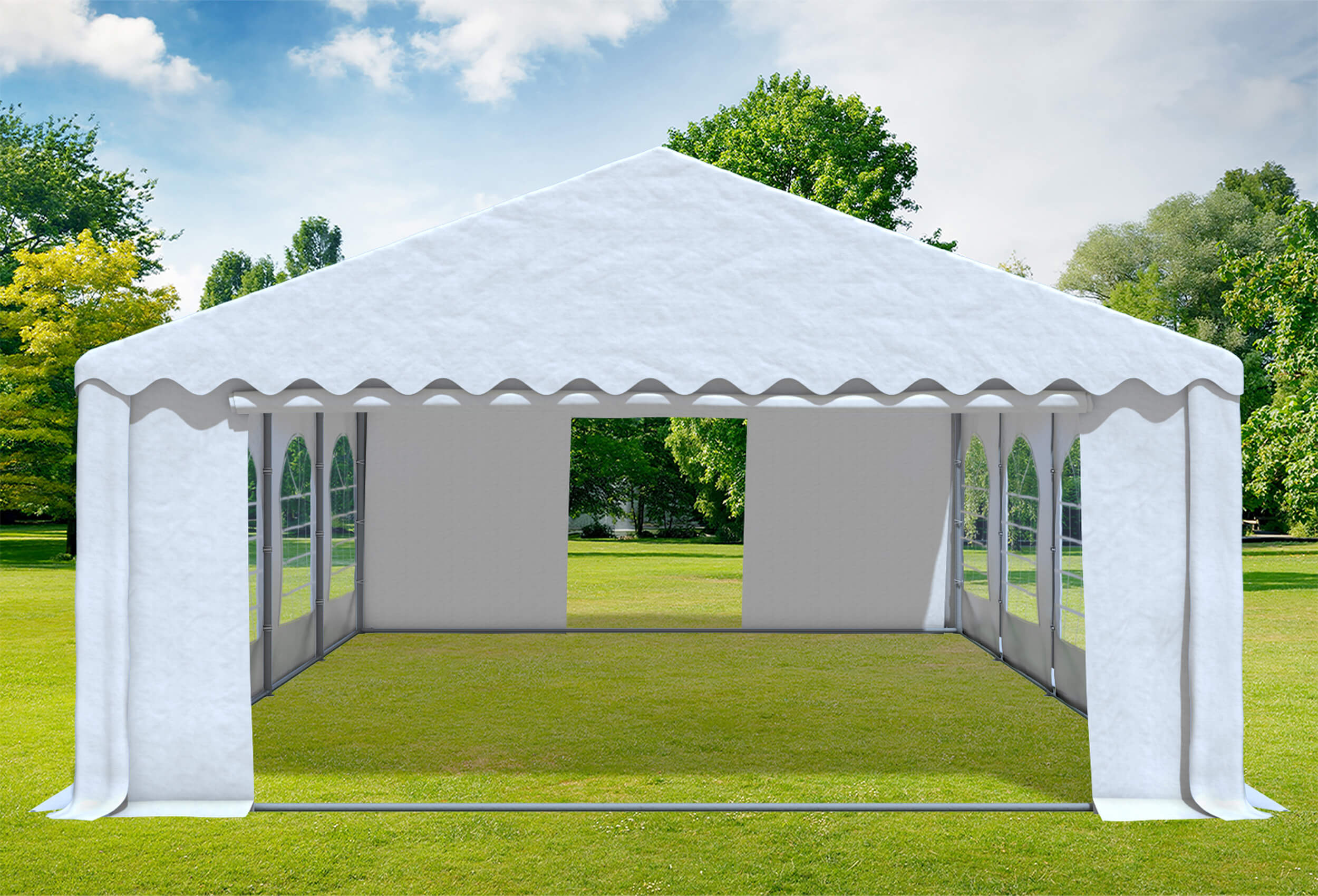 % €1,429.00 (9.8% saved)The giant among the sturdy party tents for the highest demands. Perfectly suited for large events, club parties, festivities and much more. A whopping 50 mm tube diameter and an already integrated floor frame as well as grid fibre-reinforced 550 g/m² Professional FR PVC characterise the Giant model. The tarpaulin material is certified fireproof. Super stable thanks to additional roof struts and very durable thanks to the high-quality workmanship. The side sections can be assembled individually at 2 metre intervals as required. This results in many assembly variants depending on the size. Highest quality level thanks to high material thicknesses in all respects as well as high-quality and robust workmanship. Accessories already included in the scope of delivery ensure that it is ready for immediate use. Easy to clean thanks to the glossy, smooth surface.