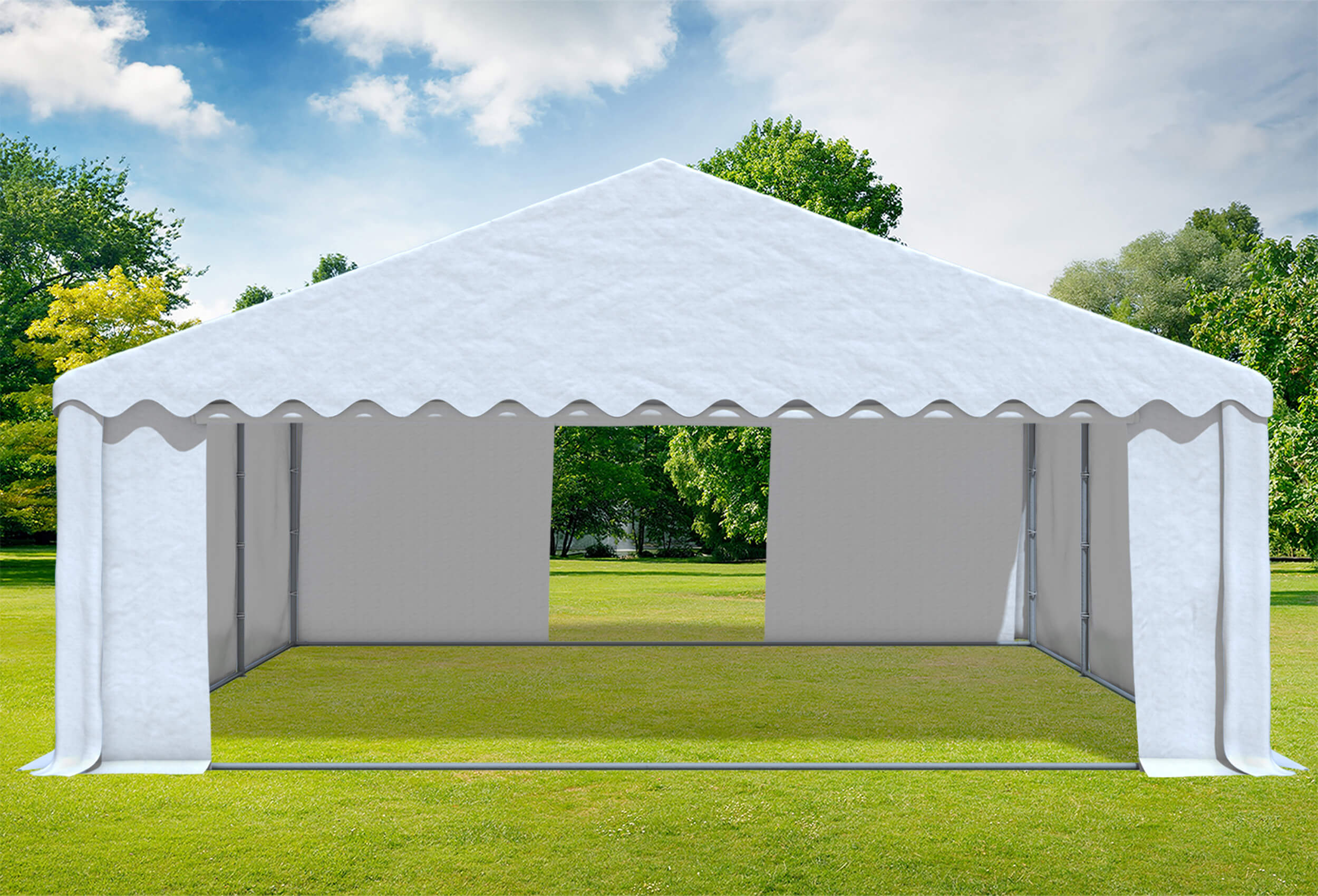 % €1,429.00 (9.8% saved)The giant among the sturdy party tents for the highest demands. Perfectly suited for large events, club parties, festivities and much more. A whopping 50 mm tube diameter and an already integrated floor frame as well as grid fibre-reinforced 550 g/m² Professional FR PVC characterise the Giant model. The tarpaulin material is certified fireproof. Super stable thanks to additional roof struts and very durable thanks to the high-quality workmanship. The side sections can be assembled individually at 2 metre intervals as required. This results in many assembly variants depending on the size. Highest quality level thanks to high material thicknesses in all respects as well as high-quality and robust workmanship. Accessories already included in the scope of delivery ensure that it is ready for immediate use. Easy to clean thanks to the glossy, smooth surface.